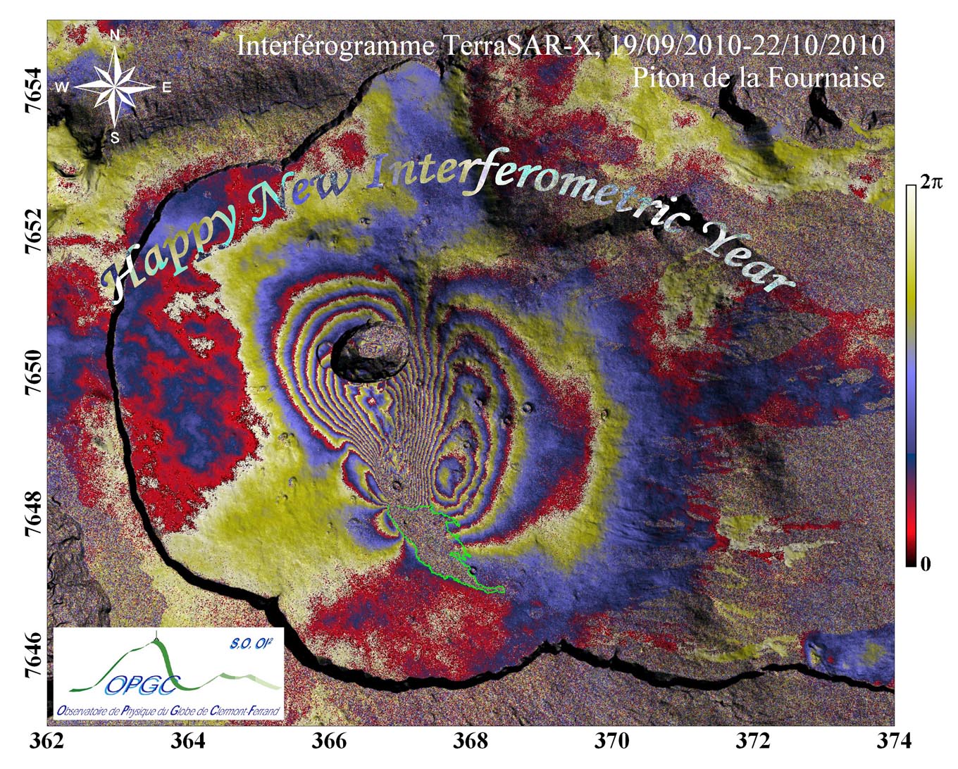 I - Introduction - The Observation ServiceThe Observation Service, OI², is a recognised component of the National Service for Volcanological Observations. The mission of OI² is the regular monitoring of ground movements brought about by the volcanic activity of Piton de la Fournaise volcano, Reunion Island, using InSAR data. Movement of magma inside and beneath a volcano is generally manifested by inflations or subsidences of the ground surface. Various in situ geodetic methods (comprising a network of ground-based instruments which needs to be installed and maintained, such as GPS receivers and inclinometers) allow the evolution of the volcano's shape to be measured through time. These methods are routinely used in the majority of volcanic observatories. The technique used by the Observatory Service OI², radar interferometry, has the advantage of not needing any ground-based installations since it is based on data acquired in space. Radar interferometry was developed at the start of the 1990s, following the launch of the first radar satellites (ERS-1 & -2). It consists of measuring the distance between the ground and the satellite using the return time of the radar pulse emitted by the satellite. A radar image of the distances between the Earth and the satellite can then be obtained by carrying out these measurements for a large number of points within a limited geographical area. Comparison of the acquired radar images at different periods in time allows changes in the Earth-satellite distance, due to ground movements, to be detected. When considering active volcanic terrain, these ground movements provide information on the physical nature of a volcano's magma feeder system (the underground pipe network) and on the way in which magma moves through this feeder zone. This information is valuable not only for ongoing volcano monitoring but also for the understanding of the fundamental processes which control its functioning and long-term evolution. Thus, within the framework of the Observation Service OI², 429 radar images covering the Piton de la Fournaise have been obtained from the ENVISAT-ASAR satellite (operating at C-band), dating back to 2003. These images were supplied free to the "Observatoire de Physique du Globe" at Clermont-Ferrand by the European Space Agency. Based on these images, the ground displacements of many successive eruptions have been measured. This exceptional database of radar images means that Piton de la Fournaise is now a unique reference site worldwide in terms of the application of radar interferometry for monitoring volcanic activity. More recently, data from ALOS-PALSAR (operating at L-band), TerraSAR-X (operating at X-band), COSMO-SkyMed (operating at X-band) and RADARSAT-2 (operating at C-band) have been added to supplement the ASAR data. The combined contribution from these five sources broadens the sensitivity to movements and the acquisition geometry, which in turn means that the ground movements can be more precisely determined, as well as the driving processes behind these movements. The entire InSAR database produced within the framework of the OI² Service is accessible via the CASOAR web site.